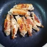 - 2 中火で熱したフライパンに1を皮目から入れ、焼き色が付くまで焼きます。裏返して鶏手羽中に火が通るまで焼きます。