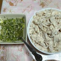 鶏むね肉はささみをゆでたものに、白ネギを輪ネギを切って代用しました!タレめっちゃ美味しい!!!