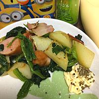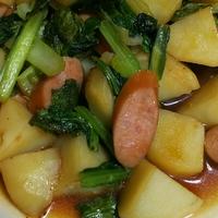 - 7 2、4を入れて中火で炒め、じゃがいもに焼き色が付いたら3、1の茎の部分を入れて炒めます。