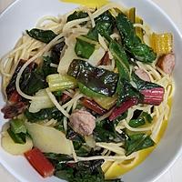 じゃがいも→パスタ、ソーセージ→パンチェッタで作りました。スイスチャードは茎が太めだったので斜めに細切りしてます。