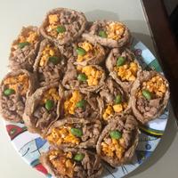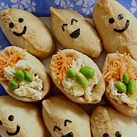 - 6 お稲荷さんの皮に1を詰め、3、5をのせ、枝豆をのせて完成です。