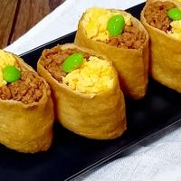そぼろのオープンいなりのご紹介です。おいなりさんの盛り付け方をアレンジするだけで見た目も華やかな一品に仕上がりますよ。さっぱりした酢飯と甘辛く味つけしたそぼろがよく合います。簡単に作れるので、ぜひお試しくださいね。