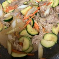 - 4 中火で5分程炒め、ズッキーニがしんなりしてきたら(A)を入れ、全体に味がなじんだら火から下ろします。
