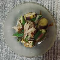 - 4 粗熱の取れたナスとオクラを、ミョウガともずくと一緒にボウルへ入れて混ぜ合わせ、ラップをして冷蔵庫で1時間程度冷やします。