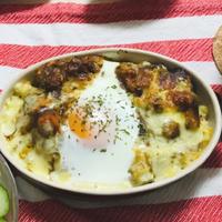ホクホクのマッシュポテトの上にトロトロのカレーとチーズをのせた、食べ応えのある一品です。玉ねぎやウインナー、ブロッコリー、ひき肉などお好みの具材を加えてアレンジも自在。仕上げの半熟卵がとろけ出してカレーと絡み合う瞬間がたまりません。カレールーを使って手軽に作れるのが嬉しいポイント。トースターで焼くと、チーズの焼き色も綺麗に付いて食欲をそそります。