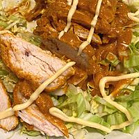 食べ散らかしの汚い写真すみません。タレが余るのでキャベツ等の野菜と一緒に食べると美味しい。子どもにはやや辛めなのでカレー粉を少し減らしても。