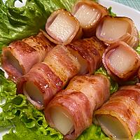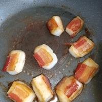 - 2 薄切りハーフベーコンに1をのせて巻きます。