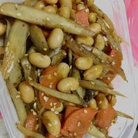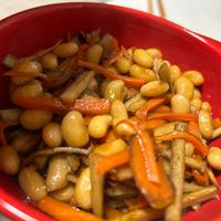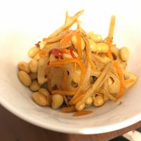 いつものきんぴらにひと工夫。にんじん入りのきんぴらごぼうに、さらに大豆の水煮をプラスしたきんぴらです。ふだんのきんぴらごぼうに飽きたら、こんなアレンジも試してみてくださいね。