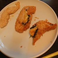 ささ身を観音開きにして、大葉とチーズを挟んで揚げました。が、ご覧のように無惨な結果に………。