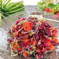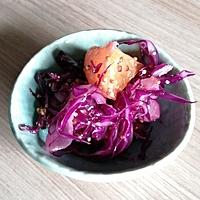 - 1 紫キャベツは千切りにします。ボウルに入れ、塩を加えてよく揉み、10分程置き、水気を絞ります。