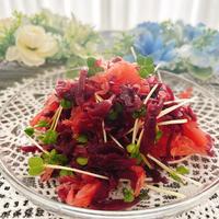 紫キャベツとグレープフルーツのマリネのご紹介です。色鮮やかな紫キャベツに程よい苦味のあるグレープフルーツと酸味のあるレモン汁で、さっぱりといただける一品です。粒マスタードもよいアクセントになっていますよ。簡単に作ることができるので、食卓にあと一品欲しい時などにもおすすめです。ぜひ、お試しくださいね。