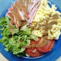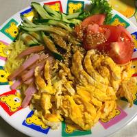 きゅうり、レタス、ハム、いんげん、錦糸玉子、トマト。ごまたっぷり。