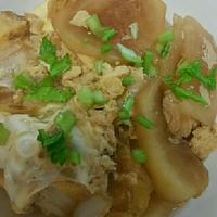 - 3 酒と砂糖としょうゆを入れて、蓋をしてさらに弱火で5分ほど煮たら、溶き卵をまわし蓋をします。