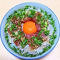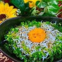 - 3 器にごはんをよそい、1、釜揚げしらす、小ねぎを盛り付け、真ん中に卵黄をのせます。