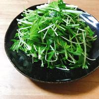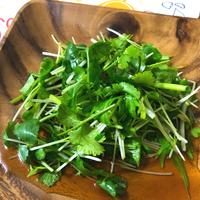 パクチーと水菜を合わせてサラダにしました。酢とレモン汁の酸味に、しゃきしゃきのパクチーと水菜がよく合い、かいわれの辛みもアクセントとなります。お好みで炒めた鶏ひき肉を入れるとボリュームサラダにもなります。是非お試しくださいね。