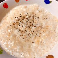 冷凍したご飯と牛乳、最後はパセリではなく黒胡椒で作りました。チーズとコンソメのおかげか少量でも満足感があって、ちょっと小腹がすいた時にも良さそうです。