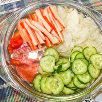 カニカマとキュウリと玉ねぎとトマトです。美味しいです。