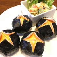 - 4 台の上に大きめにラップを広げ、のり、スライスチーズ、ロースハム、薄焼き玉子、大葉、ごはんの順に中央にのせて、ラップごと丸く握って形を整えます。