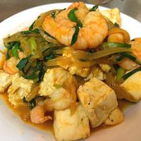 - 3 春雨とトムヤムペーストを入れ、馴染んだらエビを入れさらに炒め、エビに火が通ったら、強火にして醤油を入れて香りづけします。 火を止めてレモン汁を入れて混ぜます。