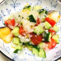 - 1 ミニトマトは8等分に切ります。紫玉ねぎはみじん切りにします。きゅうりは5mmの角切りにします。パクチーは根元を切り落とし、粗みじん切りにします。