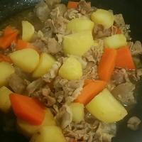 レシピ通りだと肉を入れる前に汁気がかなり少なくなったので水大さじ4とめんつゆ大さじ1を足しました。