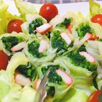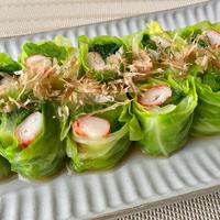 キャベツと小松菜を巻いて簡単な副菜を作ってみました。キャベツの淡色に小松菜とカニかまの彩りが映えます。味付けがめんつゆで簡単に仕上げました。何かもう一品欲しい時に簡単に出来ますので、是非お試しくださいね。