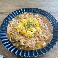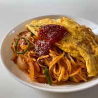 ナポリタン風のオムそばです。焼そば麺をケチャップで炒めました。パスタを茹でる手間が省ける時短メニューです。忙しい日のランチにもぴったりです。 半熟ふわふわ卵が焼そば麺と絡んで美味しいです。是非お試しください。