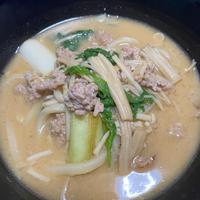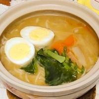 顆粒だし使わないので、出汁・醤油・味醂でうどん汁を作り、白味噌も無いから赤味噌で。野菜はある物で適当に、茹で卵をプラス。麺は米粉麺。
