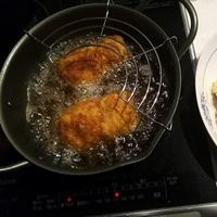 - 5 鍋底から3cm程の揚げ油を入れて180℃に熱し、4を入れます。豚ロースに火が通り、衣が色づくまで4分程揚げ、油を切ります。