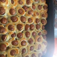 - 2 ウインナーを1つずつ置き、くるくると巻き、半分に切ります。同様に11個作ります。