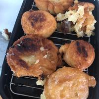 - 4 鍋底から5cmほどの高さまで、揚げ油を入れ、160℃まで熱したら、2をスプーンで1/12量ずつ丸く成形して入れて、きつね色になるまで5分程揚げます。