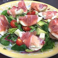 - 4 3に生ハムを巻き、お皿に盛り付けたベビーリーフの上にのせます。