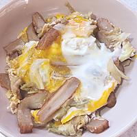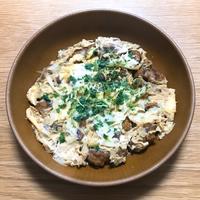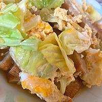 - 4 キャベツがしんなりしたら溶き卵を加え、蓋をして半熟状になるまで中火で30秒ほど加熱します。火から下ろし、お皿に盛り付けてできあがりです。