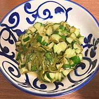 ごはんのお供にピッタリなきゅうりとめかぶのネバネバ和えです。冷やっこに乗せていただいてもいいですし、納豆に加えていただいても美味しくお召し上がりいただけますよ。わさびのピリッとした風味とごま油の香りがアクセントになっています。