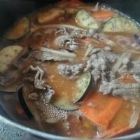 - 5 カットトマト缶、水、(A)を入れて中火で20分程煮ます。全体に火が通ったら(B)を加えて味を調え、火から下ろします。