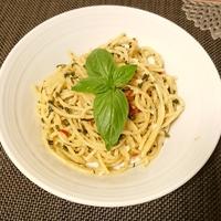 バジルペーストいらずの簡単ジェノベーゼです。 電子レンジで加熱するだけのお手軽レシピです。 バジルの葉を刻むので、さわやかな香りが引き立ちます。 新鮮なバジルの風味を楽しみながら、ぜひお試しください。