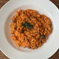 ベーコン2枚・オリーブなし・玉葱追加、好みでコンソメ多め。ベーコンと玉葱はしっかり炒めた。トマト感しっかり濃厚で美味しい。トマトジュース消費に✏️