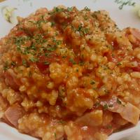 とろーりチーズがたっぷり入った、炊いた玄米から作るお手軽リゾットです。玄米のプチプチとした食感で満足感もありますよ。ベーコンの旨味もトマトベースによく合います。時間のないときにも簡単に作れますので、ぜひお試しくださいね。