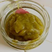 緑のルバーブだったので、緑のジャムになりました。砂糖は、150gに減らしましたが、十分甘くおいしかったです💕