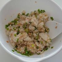 - 4 ボウルにごはん、3を入れて混ぜ合わせ、2等分にします。