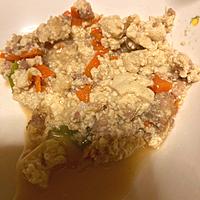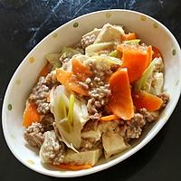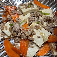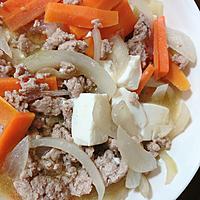 最初に豚ひき肉、人参、長ねぎを炒めてから、水と調味料(片栗粉以外)と豆腐を入れて煮た。