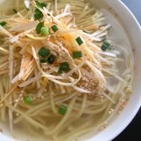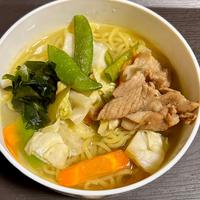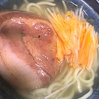子ども用にネギなし、冷蔵庫整理の炒め野菜と薄切り肉をチャーシュー風に煮たものをトッピング、…って、レシピから外れてるけど、スープは、レシピ通りに。大人用は、ネギたっぷりにしました。