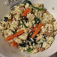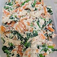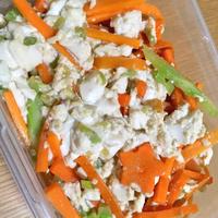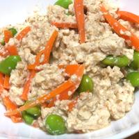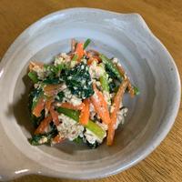 木綿豆腐とにんじん、ほうれん草を使って作ったお手軽な白和えです。すり鉢等は使わずにざっくりと混ぜ合わせただけですが、食卓にあるとなんだかホッとするような一品です。豆腐はお好みの大きさに崩してくださいね。