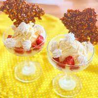 - 3 グラスにバニラアイス、イチゴ、ホイップクリームを飾り付け、最後にプラリネを乗せて完成です。