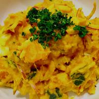 - 4 1、2を入れ卵を潰しながら全体に味が馴染むまで混ぜ合わせます。器に盛り、仕上げにチャービルを乗せて完成です。