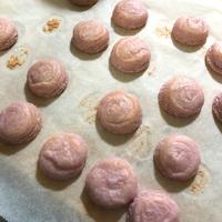 - 4 丸口金のついた絞り袋に入れ、クッキングシートを敷いた天板に直径3cm程の丸型に絞ります。表面が乾くまで30〜60分ほど置きます。オーブンを150℃に予熱します。