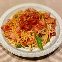 今晩のお食事に、アスパラガスとベーコンのトマトパスタはいかがでしょうか。シャキシャキとした食感のアスパラガスと、旨味たっぷりのベーコンがよく合い、とてもおいしいですよ。スパゲティ以外のパスタでもお作りいただけるので、ぜひお試しくださいね。