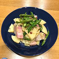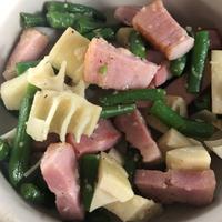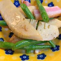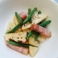 - 1 タケノコの水煮は半分の長さに切り、5mm幅に切ります。さやいんげんは筋を取り、斜め3cm幅に切ります。ブロックベーコンは1cm幅に切ります。