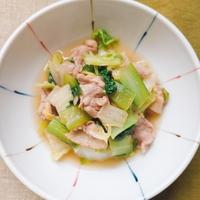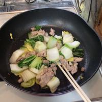 - 3 豚こま切れ肉の色が変わったら1を入れ、中火で炒めます。白菜がしんなりしたら、(A)を入れ炒め合わせます。