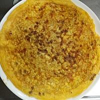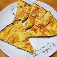 ピザみたいに3人に切り分けてお皿に盛りました。材料は大満足!でも、蓋をして5分では上の方まで卵が固まらず、ひっくり返せません。弱火にして10分くらい蒸し焼きにしました。反対にひっくり返してからは3分でokでした。